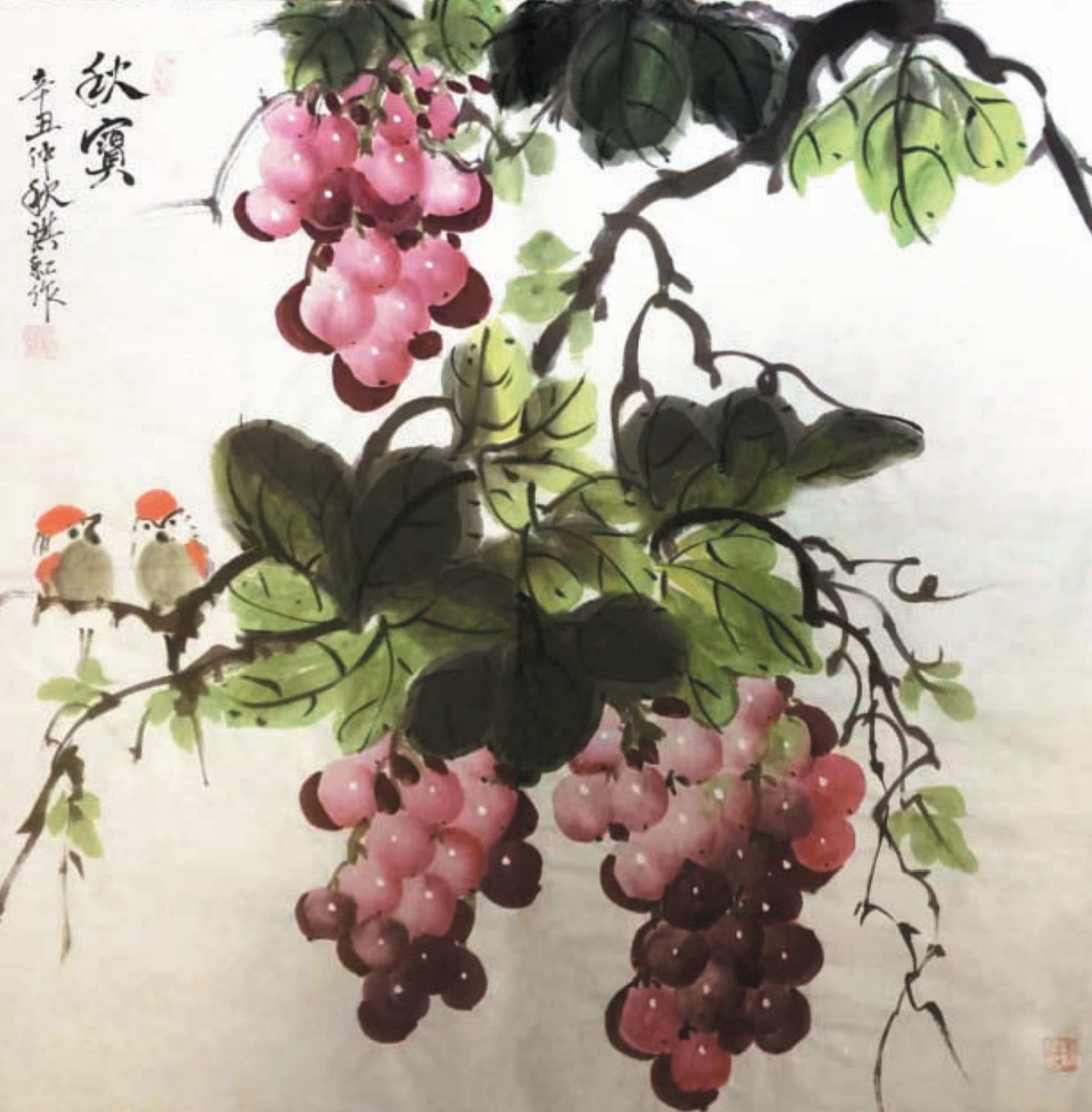 宋秋馨与缪琪红的创作,因师承关联呈现“同宗同源又各展风姿”的特点。宋秋馨笔下牡丹,强调“雅正之美”,花头造型“媚而不娇”,设色“艳而不俗”,传递“春风浩荡、盛世华章”的宏大意境;缪琪红则在传承基础上创新,以更贴近生活的视角,让牡丹、葡萄题材饱含烟火气与人文温度,画面借中西融合技法,展现出对自然生命的细腻感知。