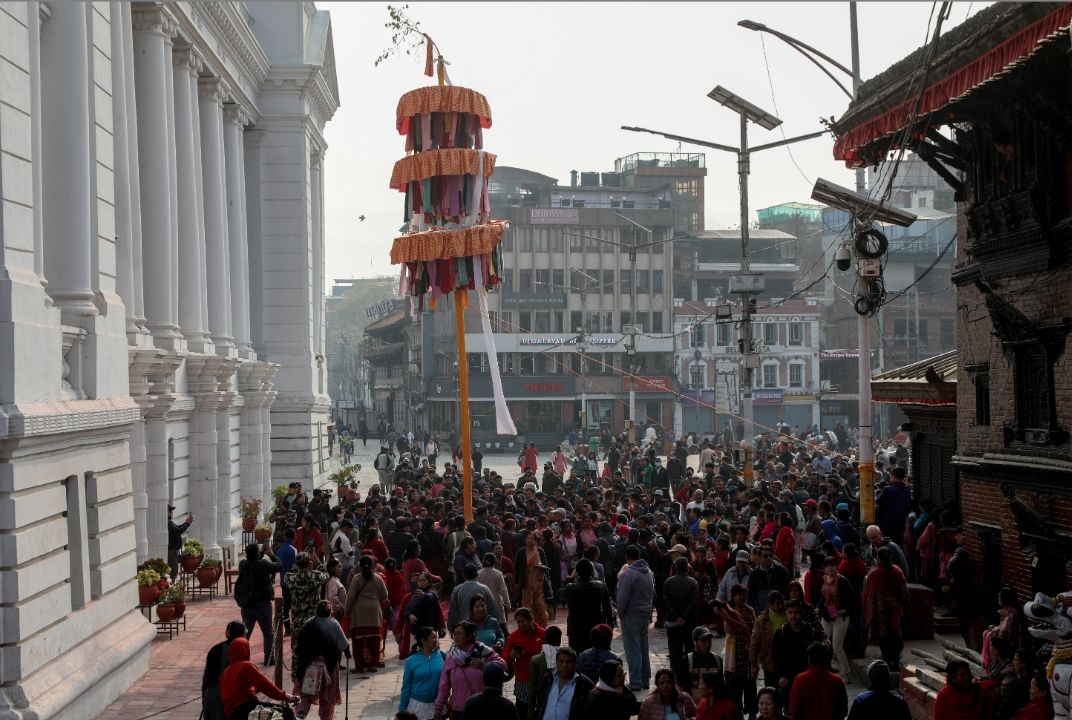 3月7日,尼泊尔民众在加德满都杜巴广场。(图片来源:中新社)
