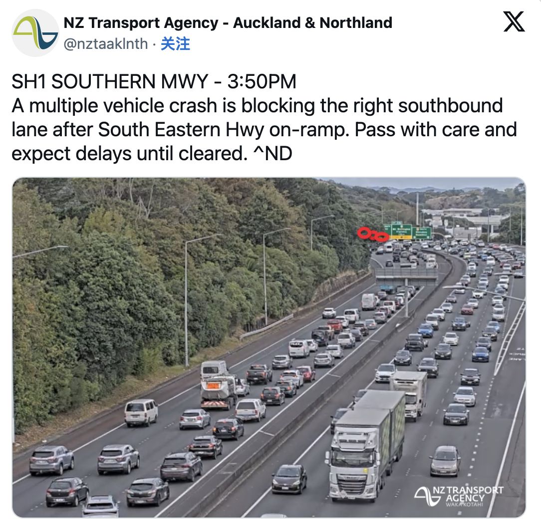 今日下午,奥克兰南部高速(Southern Motorway)发生多车相撞事故,导致严重交通延误。
