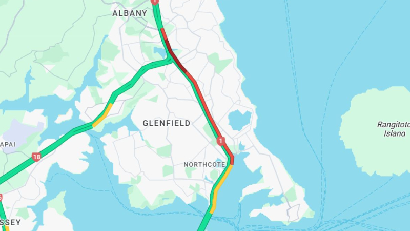 实时交通地图显示,从Albany到Takapuna一带的车流缓慢,直到上午10点左右驶近北岸大桥时,交通状况才有所缓解。