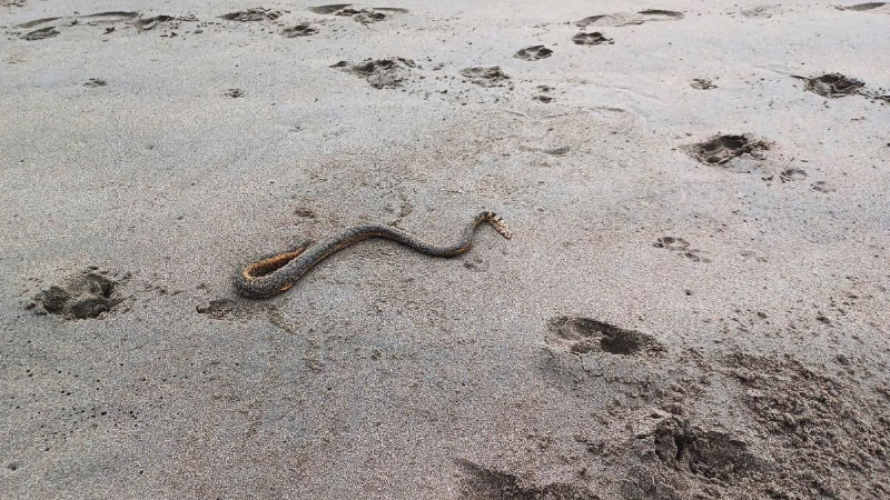 该部提醒民众,如果在海滩上发现海蛇或环蛇,应尽快远离并立即拨打0800 DOC HOT报告。