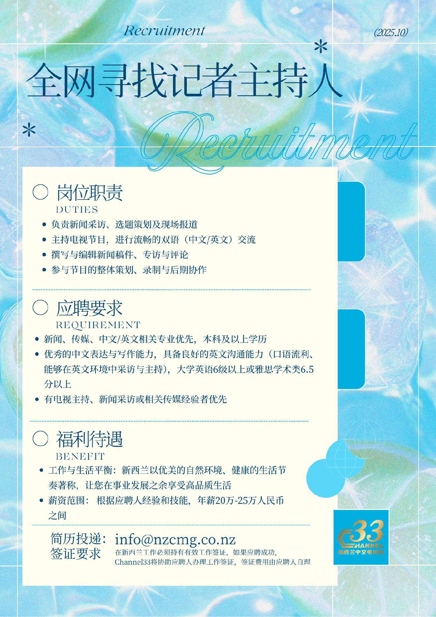 Channel33新西兰中文电视台长期致力于为全球华人提供权威、深入的新闻报道和高水准的文化娱乐节目。随着节目的发展与扩展,我们诚挚邀请优秀的新闻与传媒人才加入团队,在新西兰舞台上展示才华。