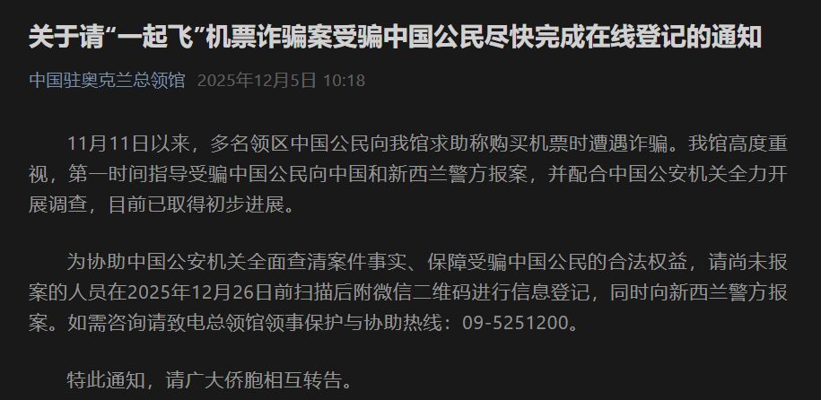 总领馆发布通知:请“一起飞”机票诈骗案受骗中国公民尽快完成在线登记!