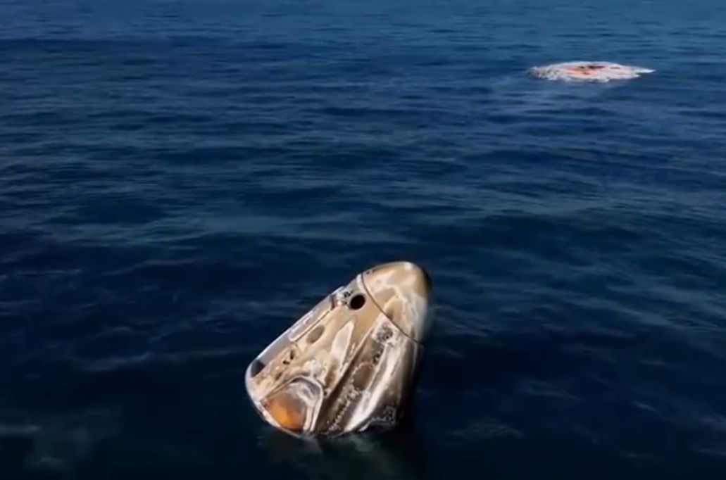 降落在佛罗里达海岸附近的“龙”飞船。(图片来源:新华社视频截图)
