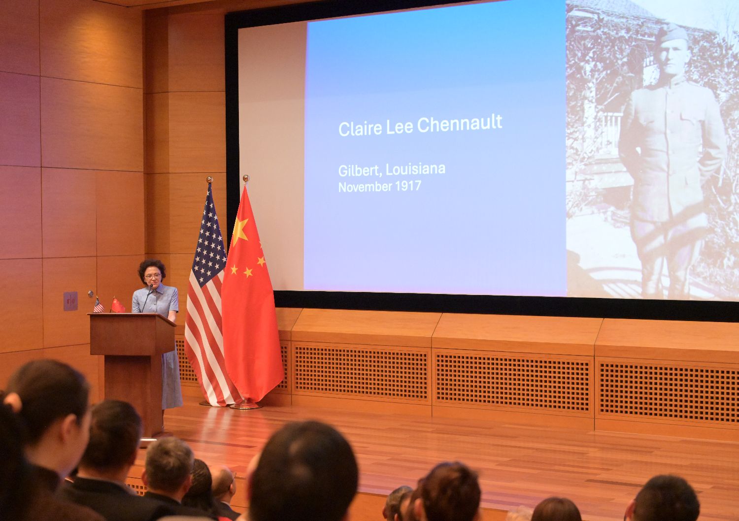 在发言的结尾,陈美丽摘读了一段陈纳德日记——“很多次我感到挫败而准备放弃,而每当面临抉择之际,我选择坚守。我一生都在奋战,直至终点。我深知,我也会见证这场抗战的终点”——她接着说,怀着同样的坚定决心,让我们共同努力,克服障碍,共同促进美中两国的友谊与合作。