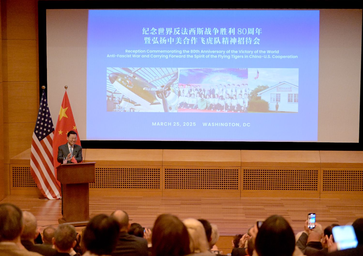 中国驻美大使谢锋致辞表示,80年前,陈纳德将军率领一批壮志凌云的飞虎队员舍生忘死、飞赴中国,中美同仇敌忾、并肩作战,谱写了捍卫和平、维护正义的壮丽篇章,为世界反法西斯战争胜利作出了重要贡献。我们隆重举行纪念活动,是为了铭记历史,传承中美人民友好的宝贵财富;立足当下,汲取中美关系前行的智慧力量;面向未来,开创两国和世界人民的美好明天。