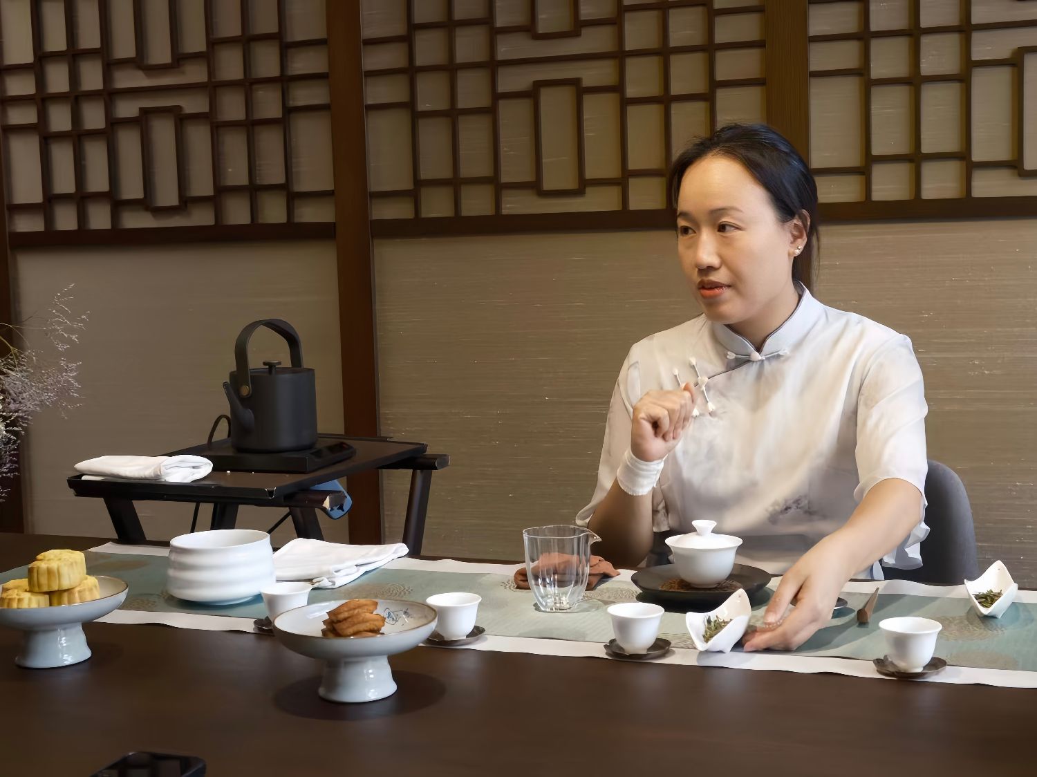 就像红酒可以放大西餐的风味,一杯对的茶也能让中餐的层次感跃然舌尖,餐厅一直在探索“茶+食”的搭配。周碎丽说:“我们借助绿茶的清爽突出虾饺的风味,以普洱的醇厚平衡叉烧的油脂,用白茶的清甜衬托甜点的回甘。起初很多当地食客不习惯这样的搭配,经过多年推广,如今茶配餐非常受欢迎。”