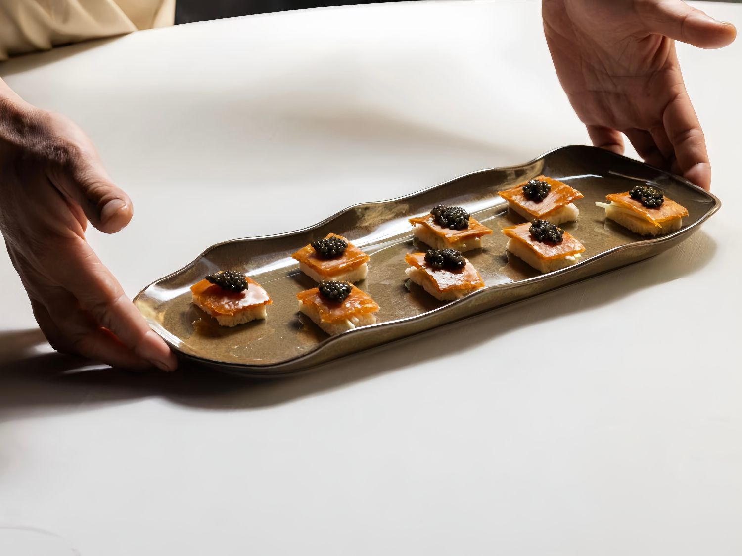 “木点心”(Mu Dimsum)茶餐厅制作的搭配鱼子酱的烤鸭。(图片来源:受访者供图/中新社)
