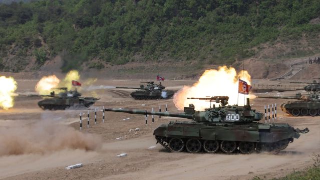 图为朝鲜人民军坦克兵部队进行对抗比赛画面。(图片来源:新华社)