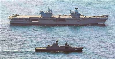 “可畏”号护卫舰与“威尔士亲王”号航母相伴而行。(图片来源:北京《中国国防报》)