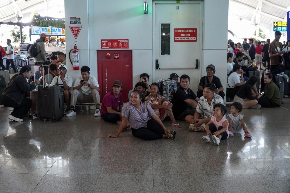 在印度尼西亚巴厘岛,由于勒沃托比-拉基拉基火山喷发导致航班延误的乘客们18日在伍拉莱国际机场休息。