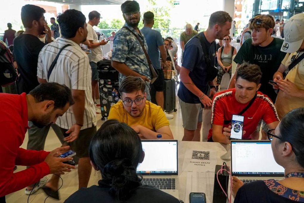 在印度尼西亚巴厘岛伍拉莱国际机场,乘客们18日查看航班信息。