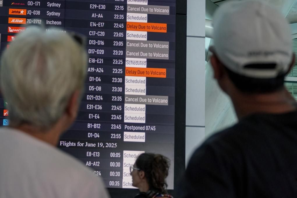 在印度尼西亚巴厘岛伍拉莱国际机场,由于勒沃托比-拉基拉基火山喷发导致航班延误的乘客们18日询问信息。
