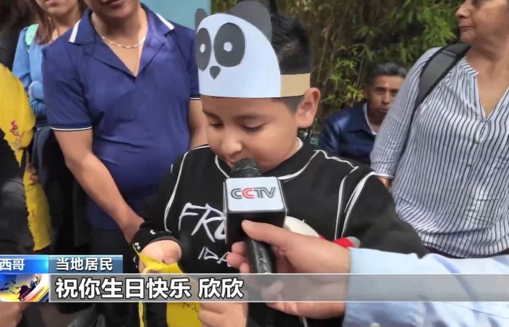 动物园为大熊猫建造了空调房,在动物园内种植竹子,以此保障大熊猫适应墨西哥气候和饮食,还在每日食谱中加入了墨西哥土特产仙人掌叶。图为当地小朋友给欣欣写生日快乐祝福。(图片来源:大陆央视新闻视频截图)