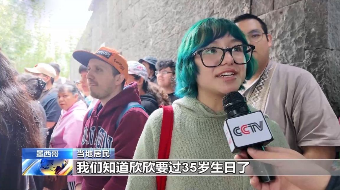 数百名墨西哥民众到现场参加了庆祝活动,很多墨西哥民众还在布条上写下了送给“欣欣”的生日祝福。(图片来源:大陆央视新闻视频截图)