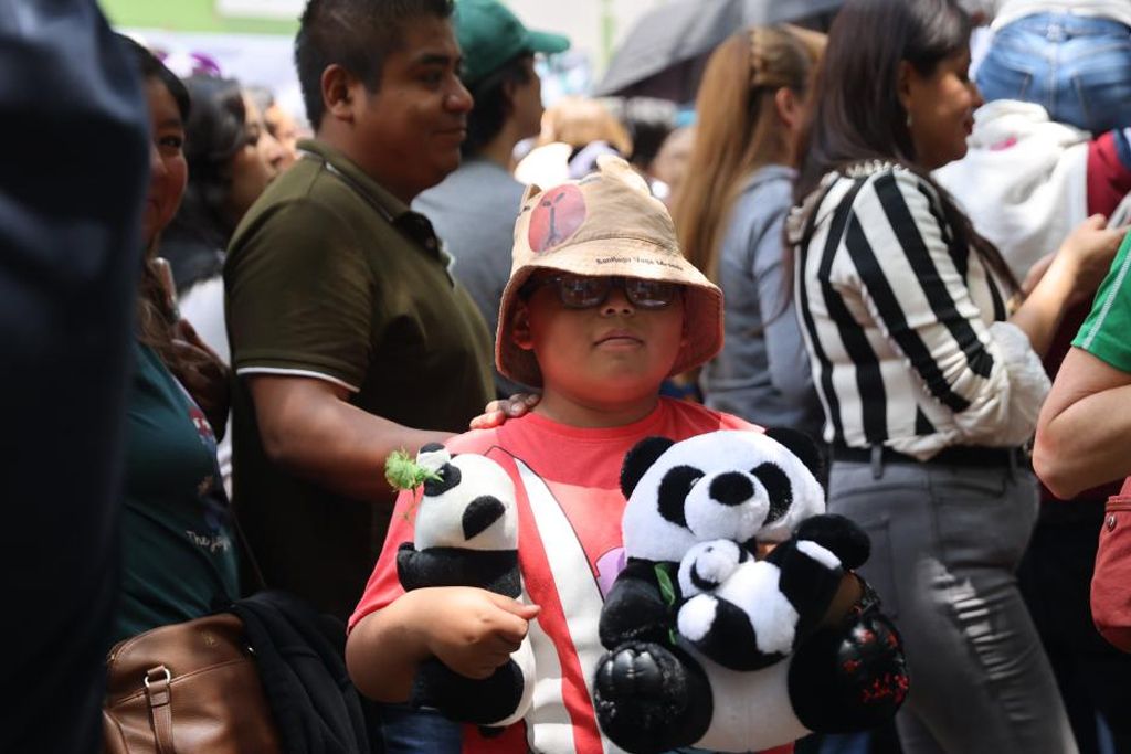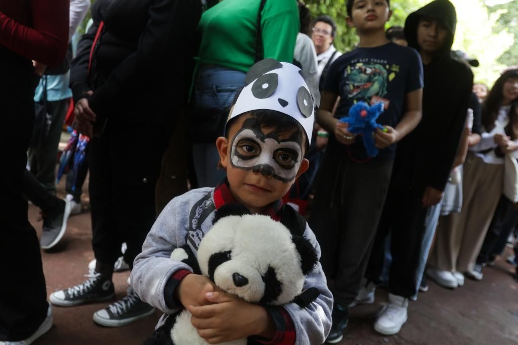 在墨西哥首都墨西哥城查普特佩克动物园,游客抱着大熊猫玩偶参加“欣欣”的生日庆祝活动。(图片来源:新华社)
