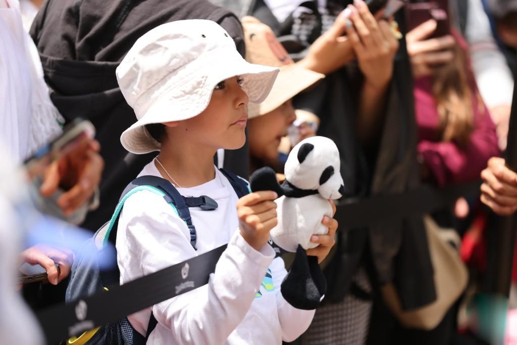 游客拿着大熊猫玩偶参加“欣欣”的生日庆祝活动。(图片来源:新华社)