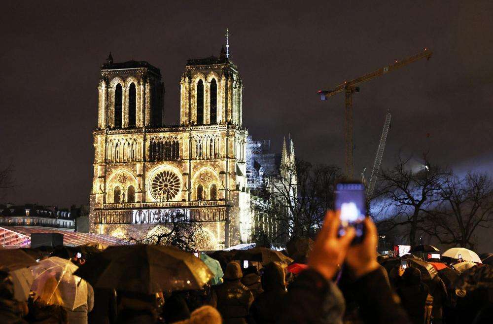 2024年12月7日,人们冒雨在法国巴黎圣母院外参加庆祝仪式,灯光在外墙上打出法语“谢谢”字样。(图片来源:新华社)
