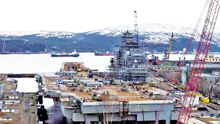 在结束叙利亚战事后,“库兹涅佐夫”号于2017年10月开始进坞展开维修升级作业,包括全面翻新飞行甲板,更换全新的动力系统、全舰管路线缆、新的舰载机起降指挥系统和导航系统以及航电设备等。但2018年,承担航母维修工作的浮动船坞沉没,船坞上的起重装置坠落时将航母甲板砸出一个直径约5米的洞。2019年,这艘航母又发生了重大火灾,导致人员伤亡。2022年底,该舰再次发生火灾。这些接连不断的事故导致完工时间从2022年一再推迟,尤其是俄乌冲突爆发后,俄军工拨款全面向前方战事倾斜,用于“库兹涅佐夫”号的维修经费严重不足。美国“商业内幕”网站此前曾提到,卫星照片显示该航母的外观近年几乎没有明显变化,显示升级维修工作已经陷入停滞。