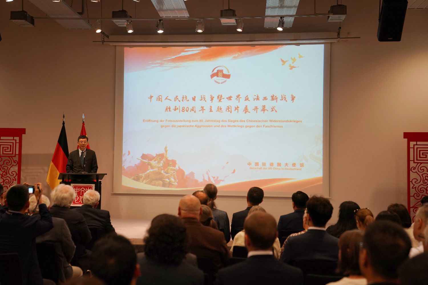 纪念中国人民抗日战争暨世界反法西斯战争胜利80周年图片展26日在柏林中国文化中心开幕。德各界人士、多国驻德使团代表、华侨华人等150余人参加。