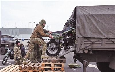 俄军人员将摩托车装入卡车。(图片来源:北京《中国国防报》)