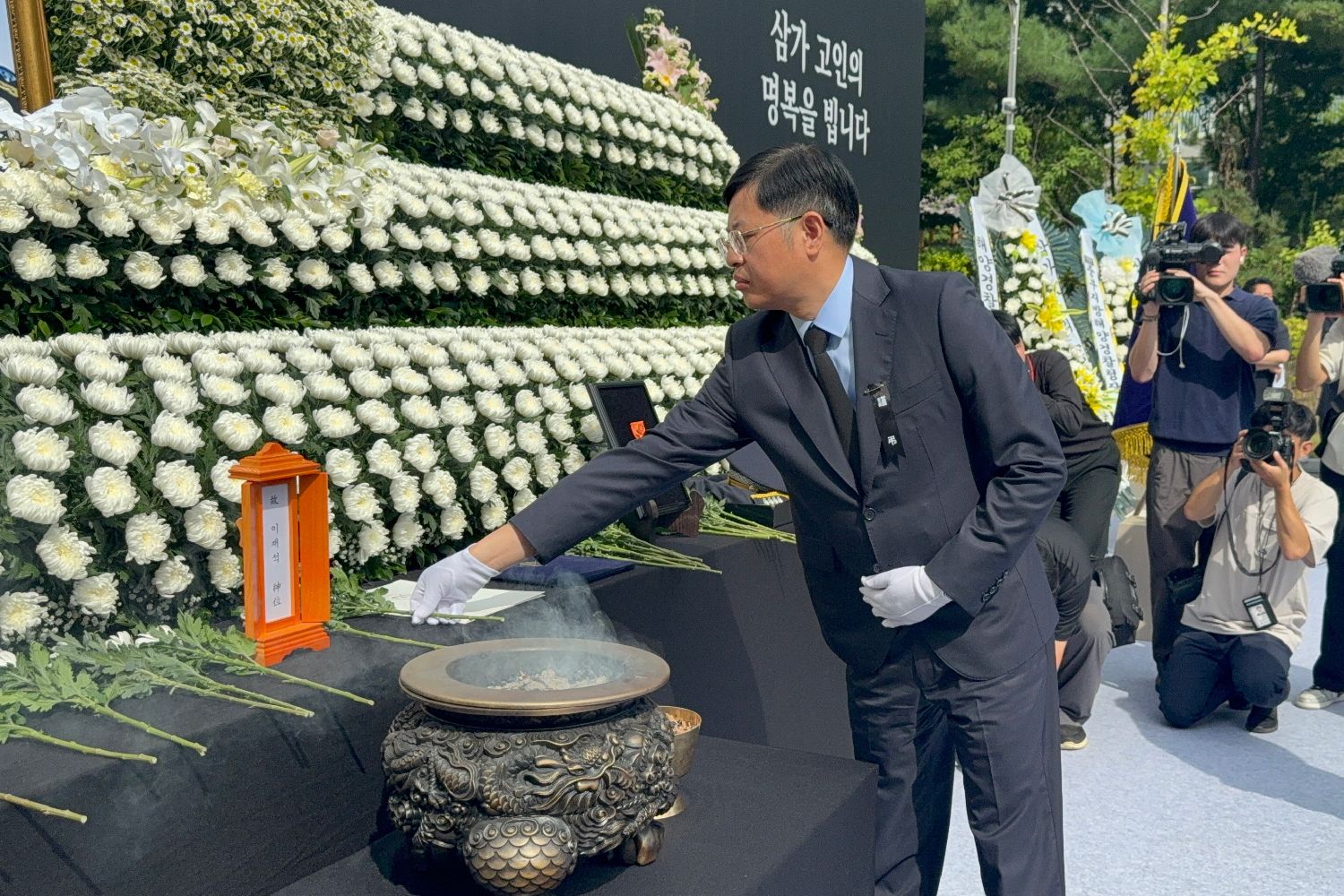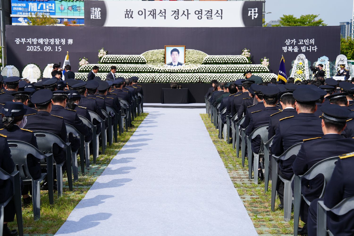 中新社报道,仪式现场布置庄严肃穆,李宰硕的遗像被鲜花簇拥,灵台上方悬挂悼念横幅,侧方摆放着韩国总统李在明、国会议长禹元植、总理金民锡所献的花圈。数百名身着警服的海警整齐静坐,神情凝重。