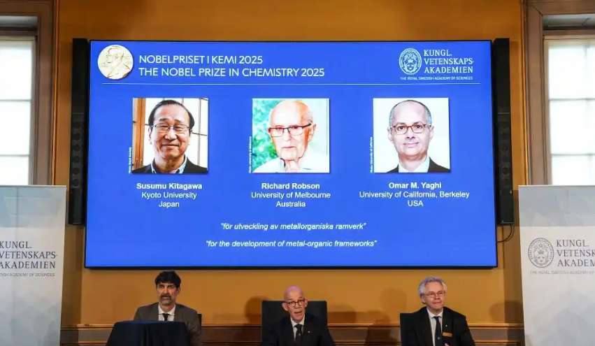 瑞典皇家科学院8日宣布,将2025年诺贝尔化学奖授予北川进、理查德·罗布森和奥马尔·M·亚吉,以表彰他们在金属有机框架开发方面所作出的贡献,他们将平分1100万瑞典克朗的奖金。