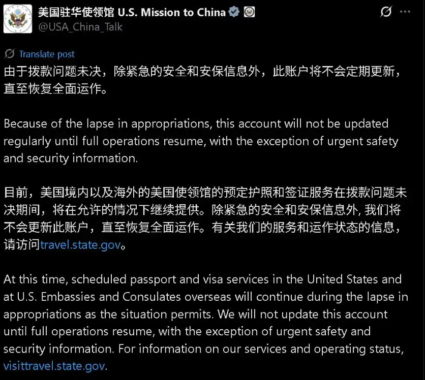 据北京环球网此前报道,美国驻华使领馆近日在美国社交平台X上的官方账号上宣布,由于拨款问题未解决,除紧急的安全和安保信息外,此账户将不会定期更新,直至恢复全面运作。