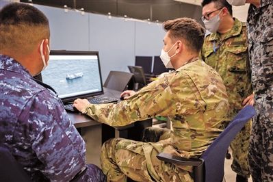 日本自卫队人员与美军人员在演习中分析情报。(图片来源:北京《中国国防报》)