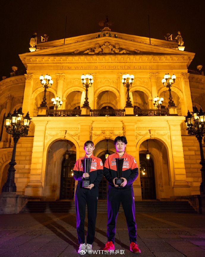 冠军松岛辉空、早田希娜夺冠后,前往法兰克福老歌剧院拍摄冠军城市宣传照。(图片来源:WTT世界乒联官方微博)