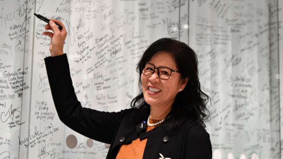 11月24日,郎平在颁奖仪式后在签名墙上签名。(图片来源:新华社)