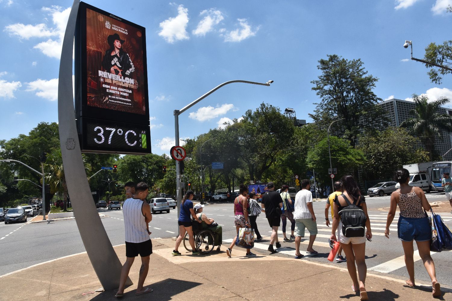 当地时间12月27日,巴西圣保罗“避暑胜地”伊比拉布埃拉公园录得37摄氏度,市民在烈日下过马路。(图片来源:中新社)