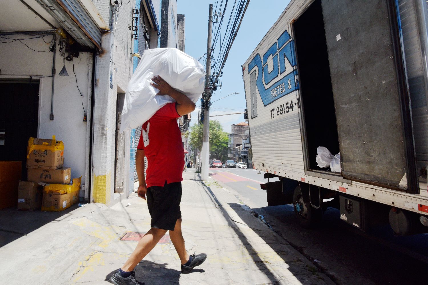 当地时间12月27日,巴西圣保罗发布红色高温预警,一位物流公司员工在布拉斯商区将宠物清凉用品搬上卡车。(图片来源:中新社)