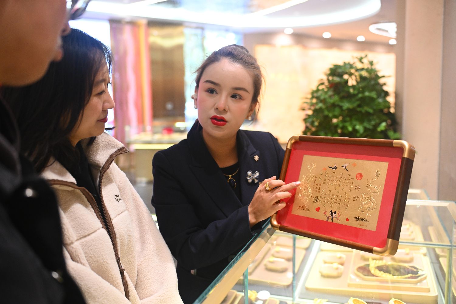 2025年11月11日,在位于甘肃省兰州市的金城银楼黄金“博物馆”内,市民选购黄金婚书。(图片来源:中新社)