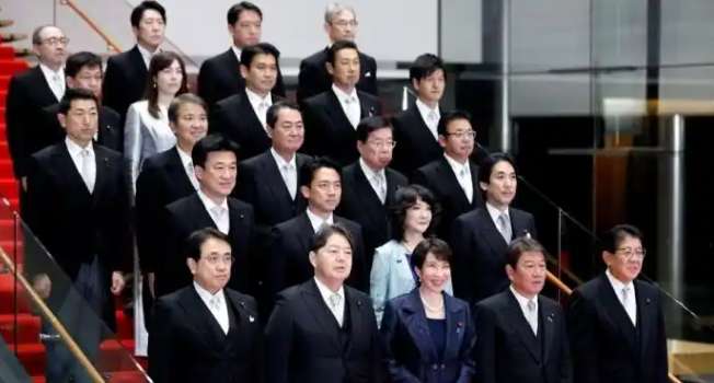 当地时间2025年10月21日晚,日本新任首相、自民党总裁高市早苗组建新内阁。图为日本首相高市早苗(第一排中)在东京的首相官邸率阁僚合影。(图片来源:中新社)