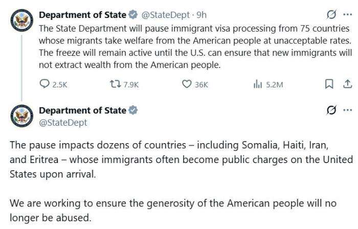 中新网报道,美国国务院在社交媒体上发布消息称,这一暂停措施将影响数十个国家,包括索马里、海地、伊朗和厄立特里亚等。