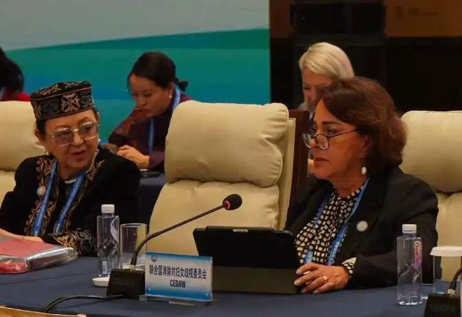 去年10月13日,联合国消除对妇女歧视委员会主席纳拉·海达尔出席全球妇女峰会并发表讲话。(图片来源:北京《新京报》)