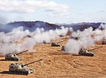 韩国陆军K-9自行榴弹炮在演习中射击。(图片来源:北京《中国国防报》)