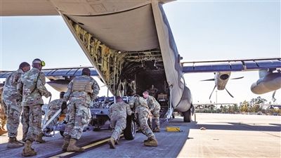 美空军人员为一架HC-130J运输机装载货物。(图片来源:北京《中国国防报》)