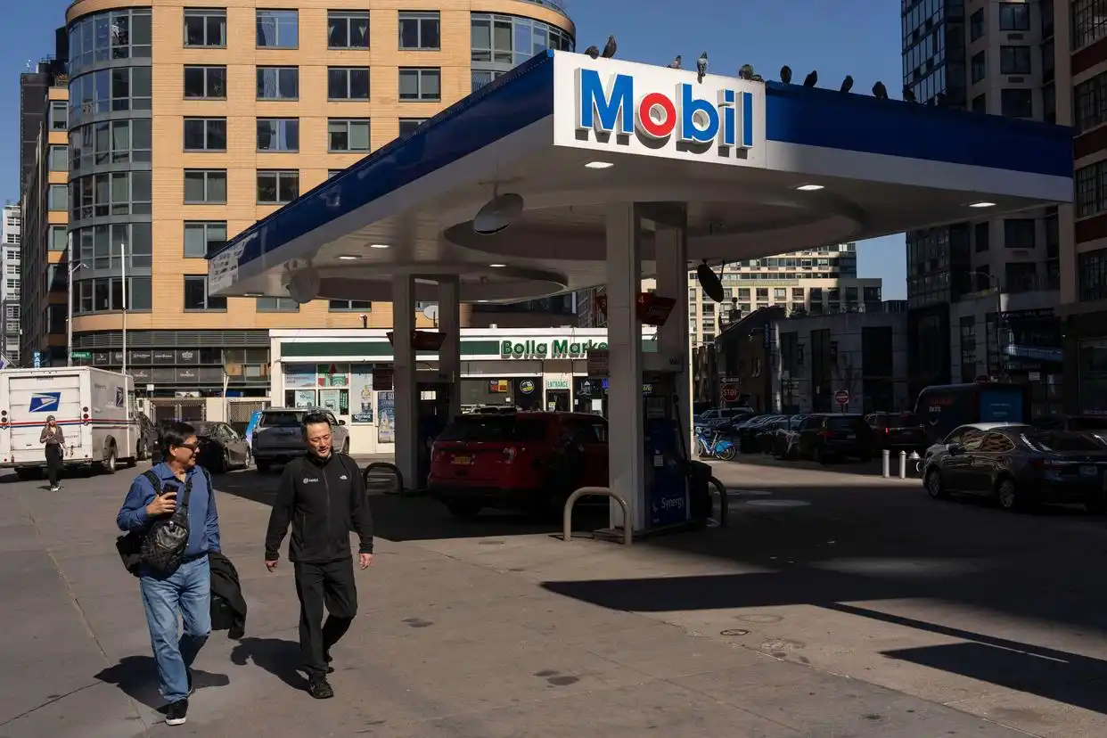 3月10日,人们走过美国纽约布鲁克林区的一处加油站。(图片来源:新华社)