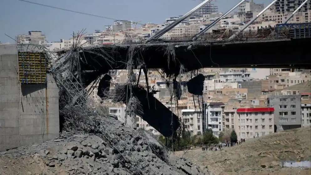 图为4月3日拍摄的伊朗卡拉季市贝伊克公路桥遭空袭受损状况。(图片来源:新华社)