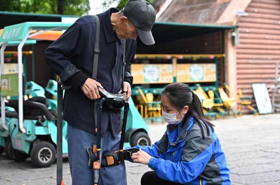 3月17日,深圳野生动物园工作人员帮老年游客邵泽仁穿戴外骨骼助力设备。(图片来源:中新社)