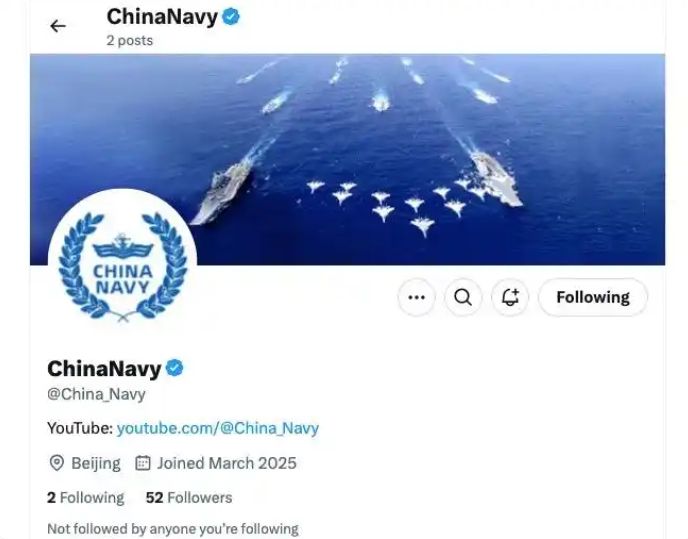 在X平台上,ChinaNavy账号下方蓝色的“✔︎”表示该账号已被确认为中国海军官方账号,背景图是双航母编队。该账号目前已发布两条帖文。最新一条显示:我们是中国海军。从亚丁湾护航到海外救援,从远海医疗服务到执行人道主义撤离任务,我们带着责任和希望,在大洋彼岸航行。我们是捍卫主权和每一寸领土的守护者,也是打造海洋命运共同体的伙伴。