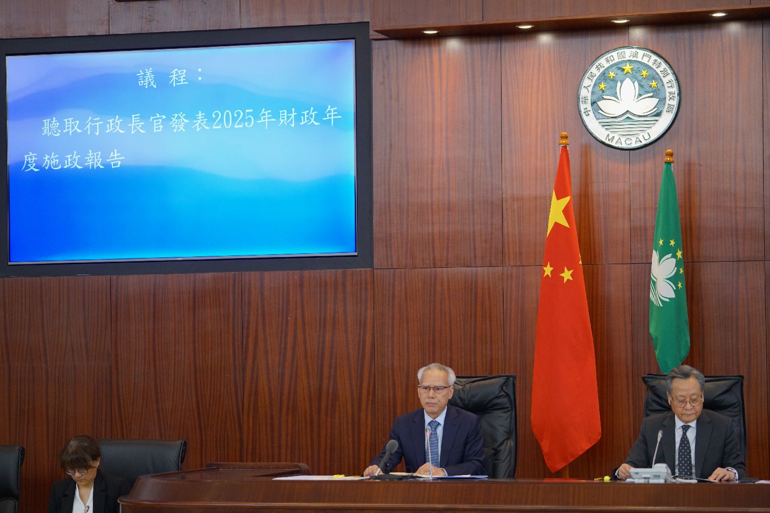 4月14日下午,澳门特区行政长官岑浩辉(右二)在特区立法会发表任内首份施政报告,题为《革新谋发展奋进开新局》。(图片来源:中新社)