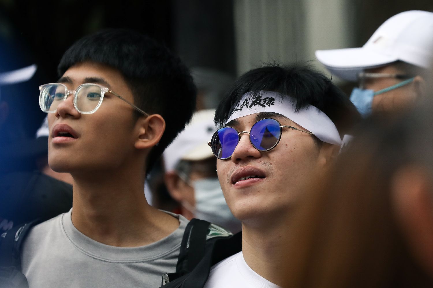 4月26日,头戴“我是台湾人,我反绿”字样发带参加抗议的民众。(图片来源:中新社)