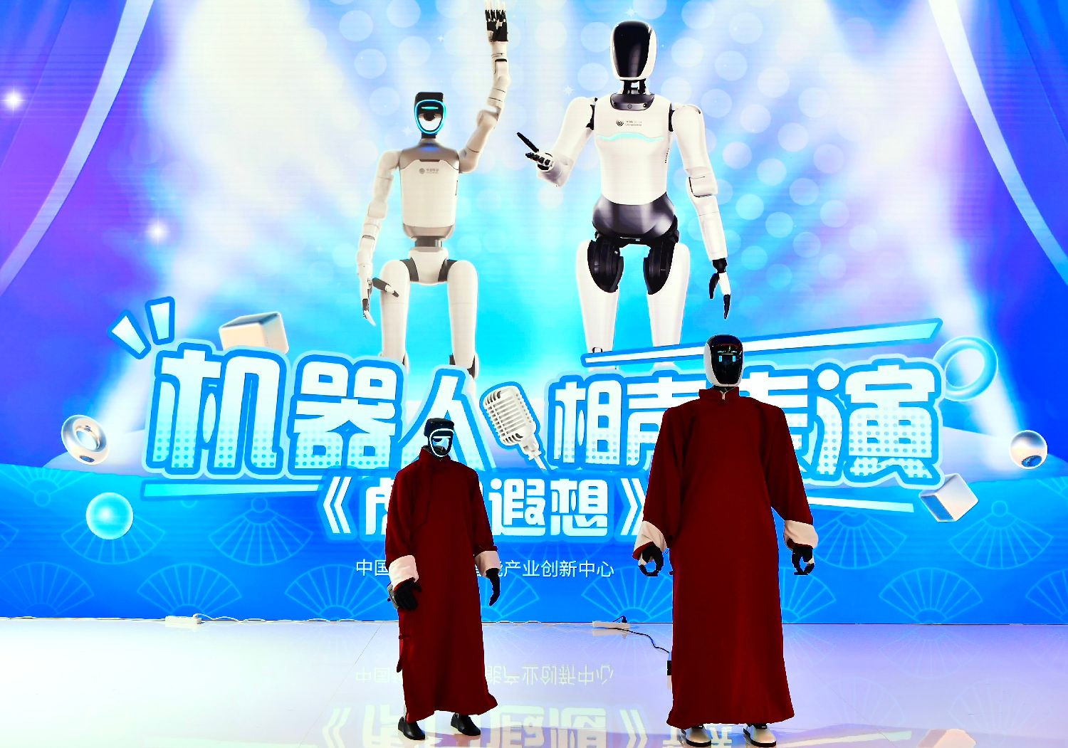 4月30日,人形机器人在数字峰会现场体验区进行相声表演。(图片来源:中新社)