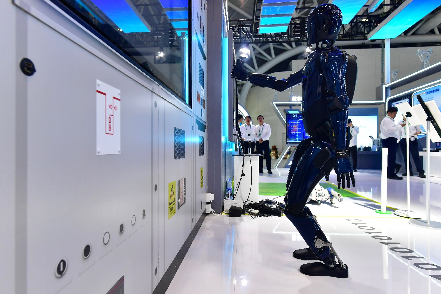 4月30日,中国南方电网有限责任公司展位的人形机器人模拟自主完成变电站巡检情景。(图片来源:中新社)