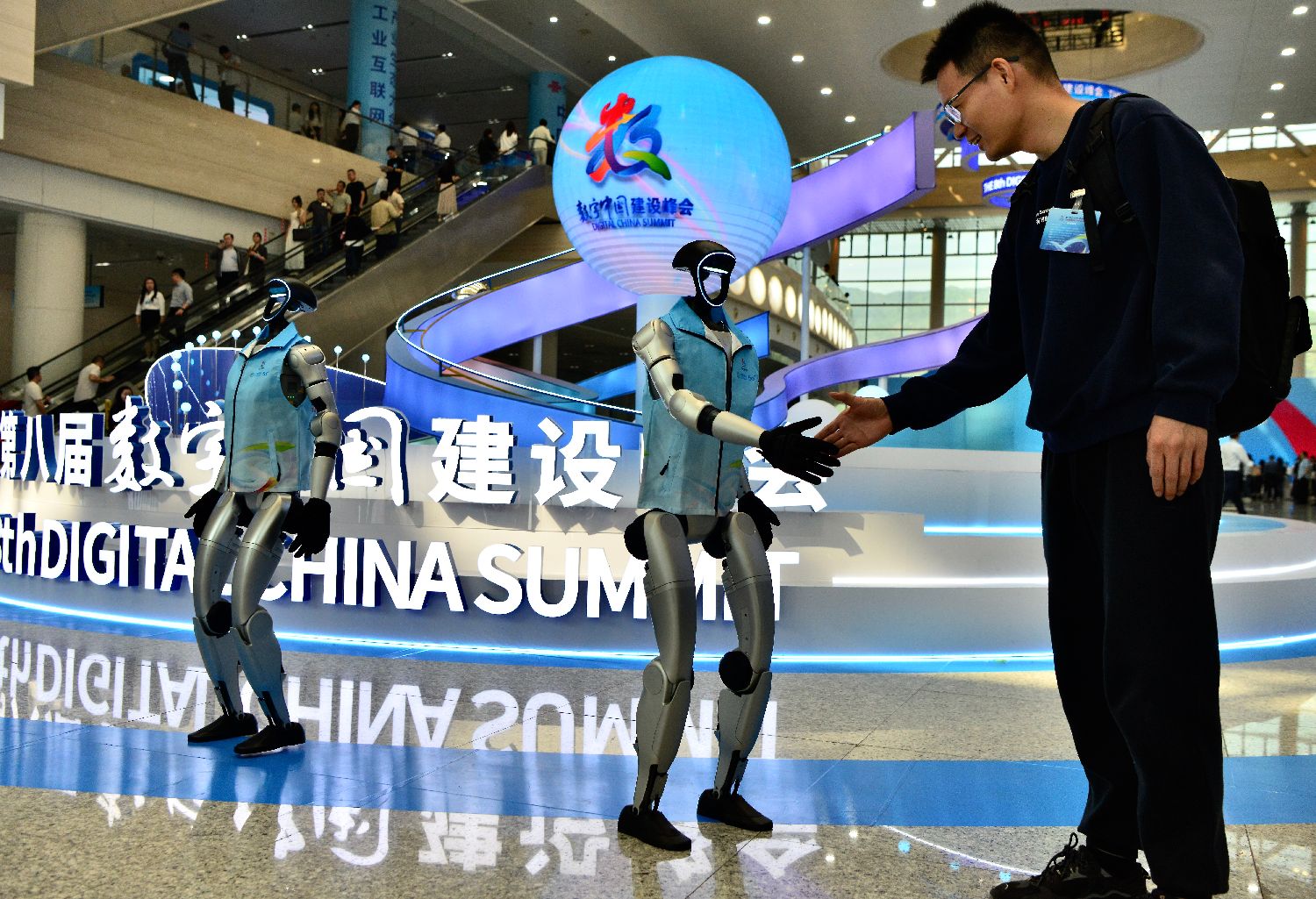 4月29日,人形机器人在数字中国建设峰会主会场内迎宾。(图片来源:中新社)