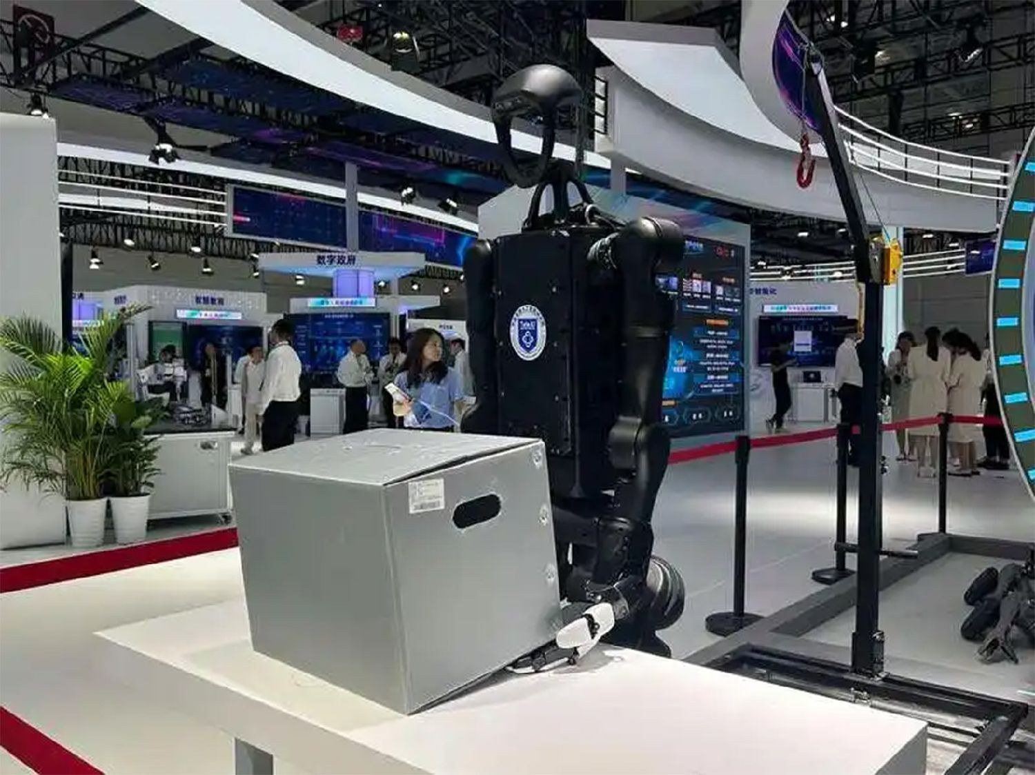 4月30日,在数字峰会现场体验区中国电信展台,中国电信人工智能研究院(TeleAI)研发的人形机器人正在搬运箱子。(图片来源:北京中青报·中青网)