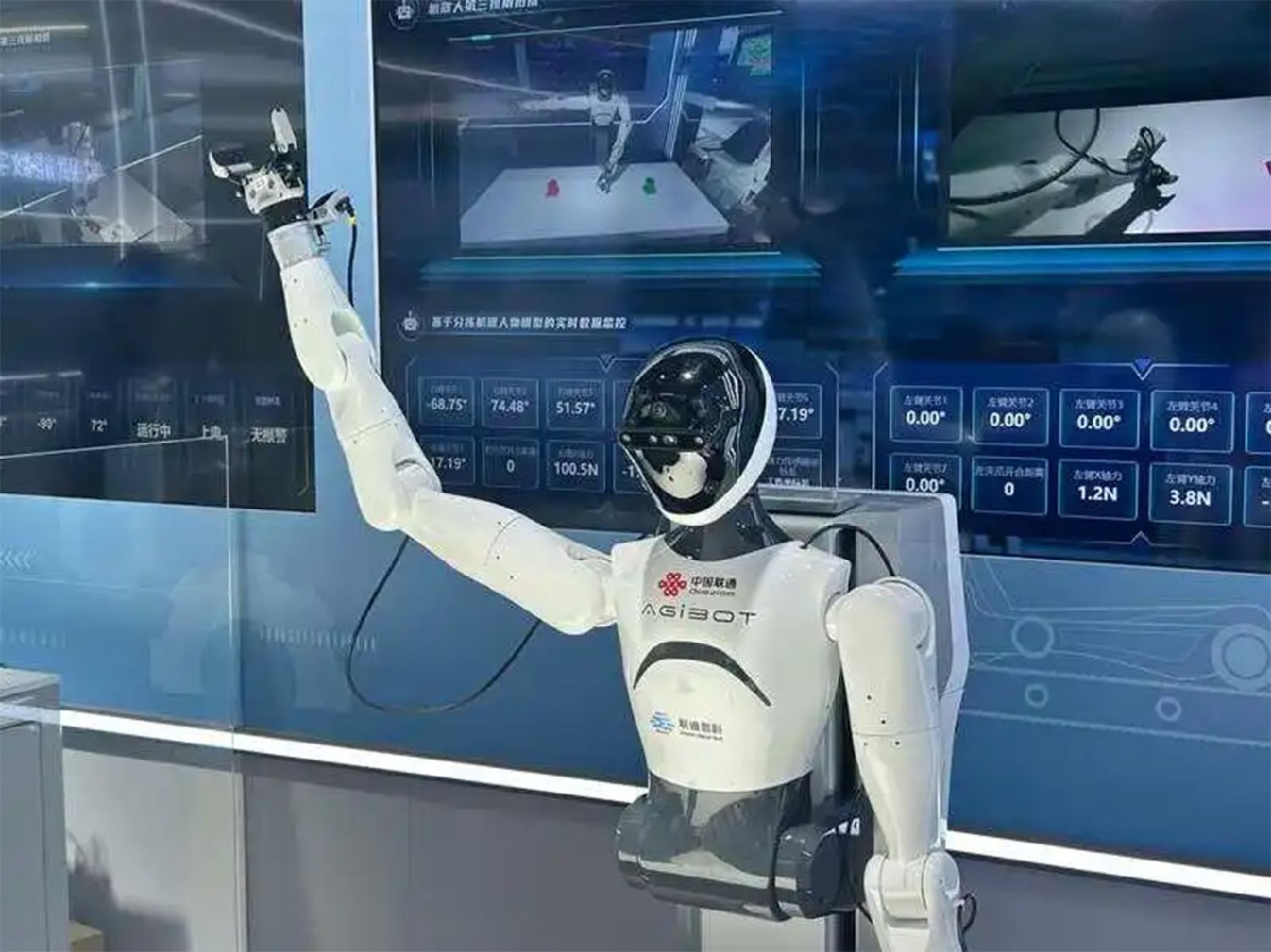 4月30日,在数字峰会现场体验区中国联通展台,一具身智能机器人正在向观众招手。(图片来源:北京中青报·中青网)